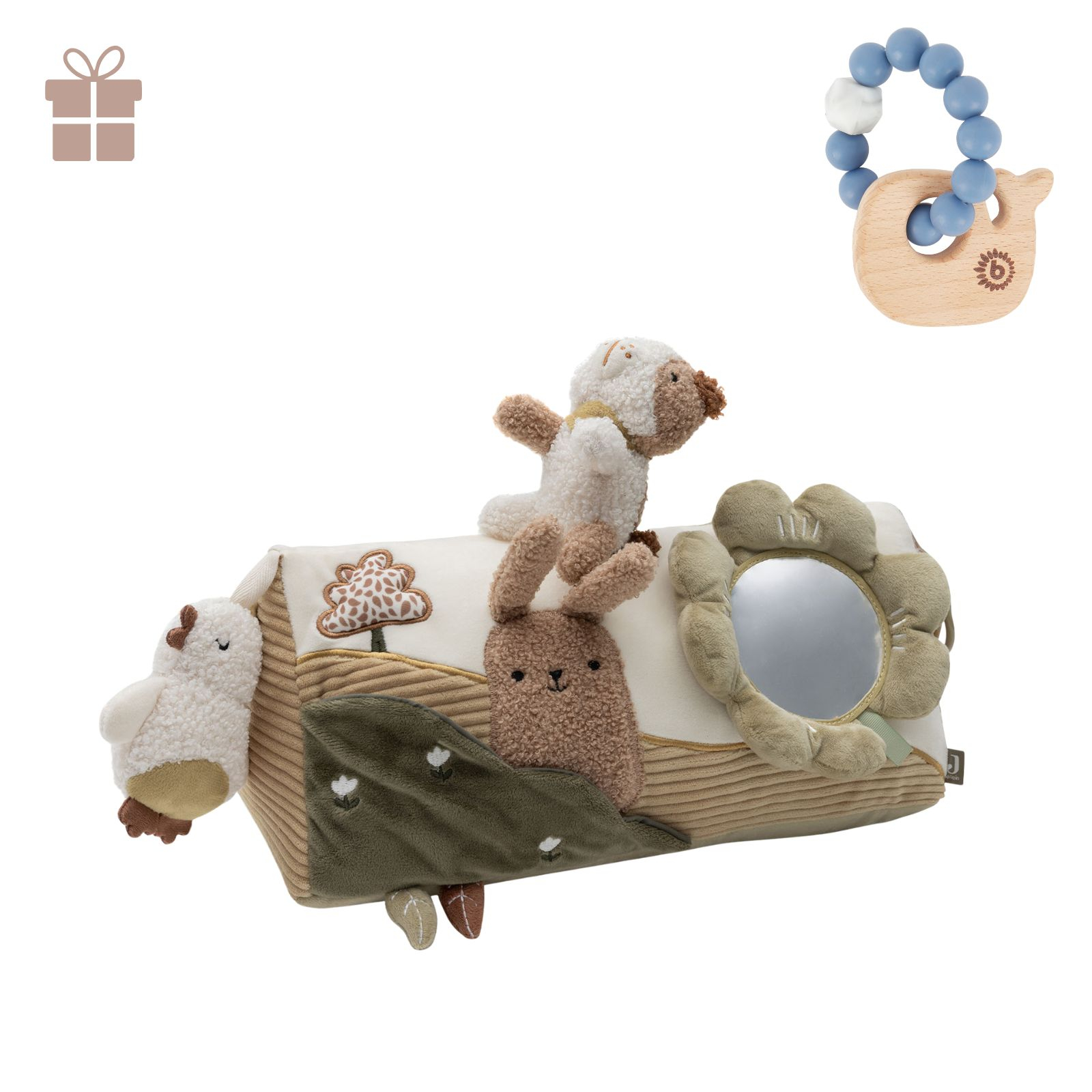 Concepută special pentru utilizarea în țarc sau pe saltea, această jucărie moale oferă multiple activități care încurajează explorarea senzorialăîncă din primele luni. Decorată cu broderii vesele cu un cățelușși un iepuraș, jucăria include accesorii interactive, precum oglinda ideală pentru timpul petrecut pe burtă.