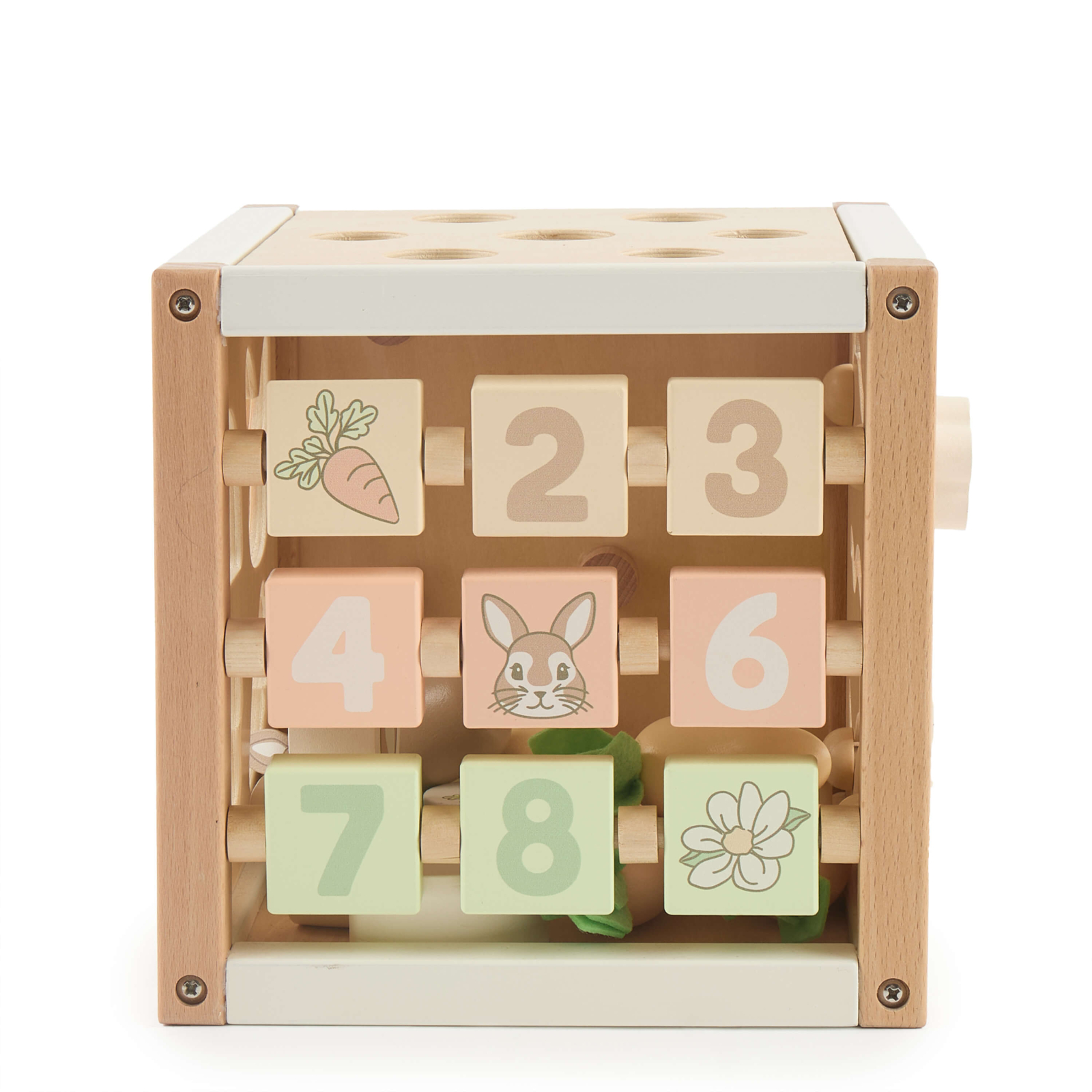 Realizat din lemn natural durabil, certificat FSC cu finisaje sigure pentru copii, cubul încurajează explorarea senzorială, coordonarea mână-ochi și gândirea logică încă din primele luni.