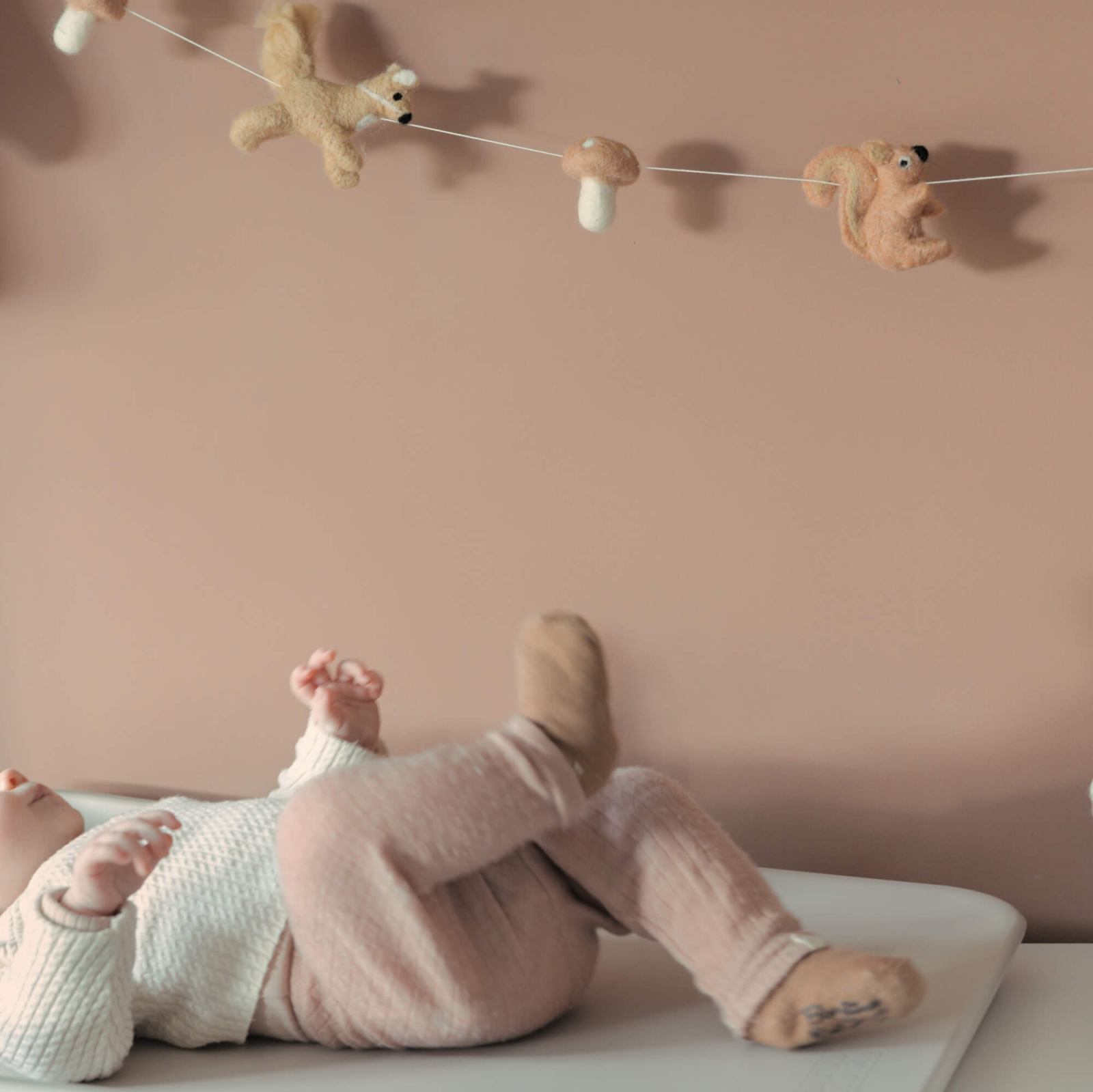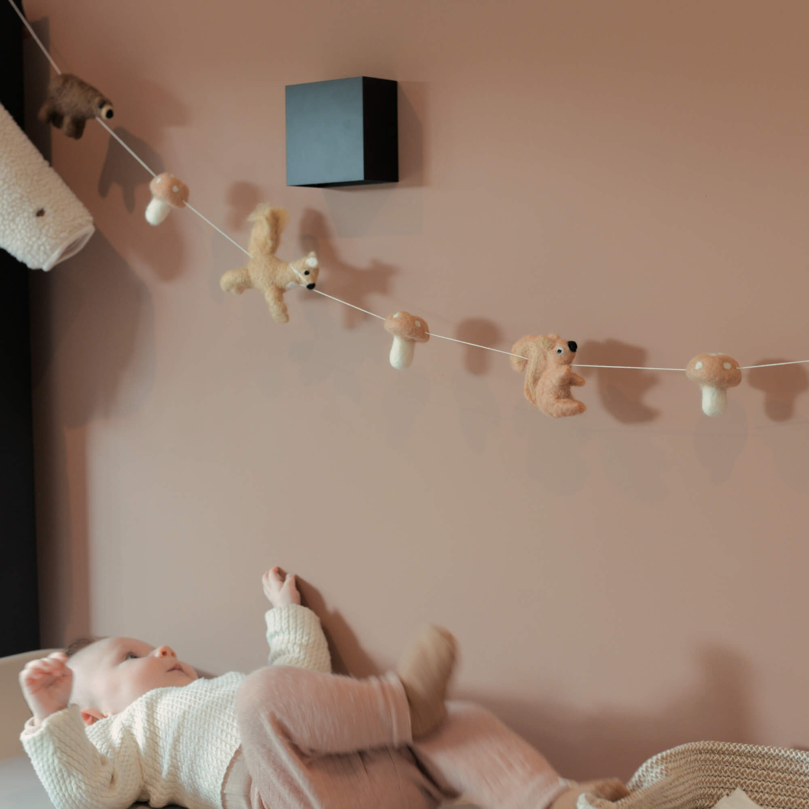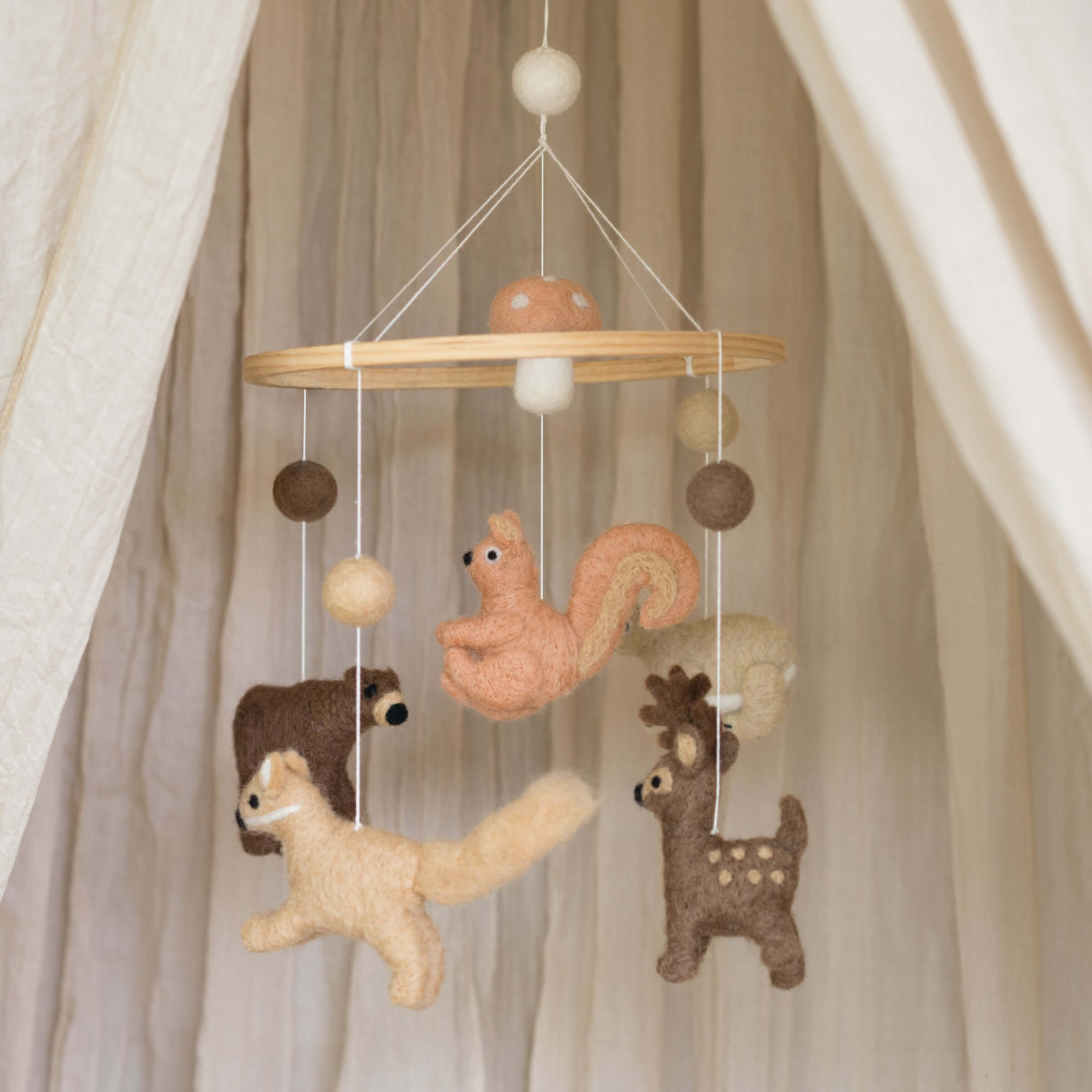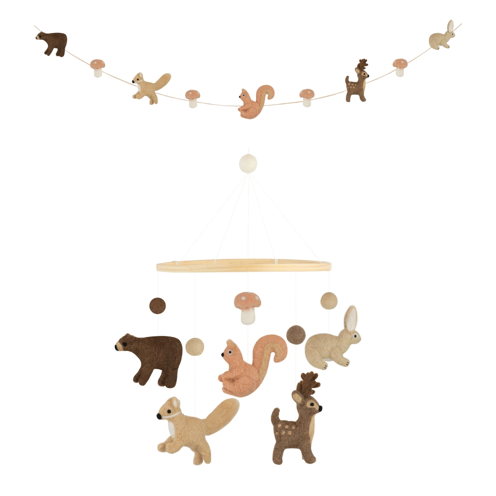 Creează un univers cald și liniștitor pentru micuțul tău cu acest set decorativ pentru pătuț bebeluși Forest, format din carusel și ghirlandă asortată, realizate manual din fetru premium.